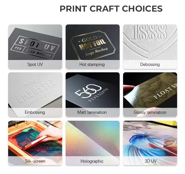 인쇄 처리: 무광 라미네이션, 바니싱, 스탬핑, 엠보싱, 광택 라미네이션, UV 코팅, 배니싱, 금박